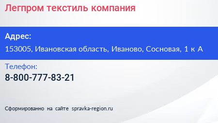 Легпром текстиль, компания по адресу 153005, Ивановская область, Иваново, Сосновая, 1 к А в дальнейшем Организация, размещена в следующих категориях: