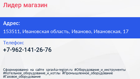Лидер, магазин по адресу 153511, Ивановская область, Иваново, Ивановская, 17 в дальнейшем Организация, размещена в следующих категориях: