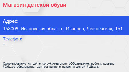 Магазин детской обуви по адресу 153009, Ивановская область, Иваново, Лежневская, 161 в дальнейшем Организация, размещена в следующих категориях: