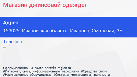 Магазин джинсовой одежды по адресу 153025, Ивановская область, Иваново, Смольная, 3Б в дальнейшем Организация, размещена в следующих категориях: