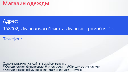 Магазин одежды по адресу 153002, Ивановская область, Иваново, Громобоя, 15 в дальнейшем Организация, размещена в следующих категориях: