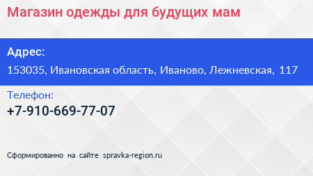 Магазин одежды для будущих мам по адресу 153035, Ивановская область, Иваново, Лежневская, 117 в дальнейшем Организация, размещена в следующих категориях:
