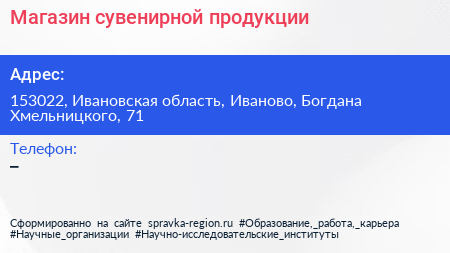 Магазин сувенирной продукции по адресу 153022, Ивановская область, Иваново, Богдана Хмельницкого, 71 в дальнейшем Организация, размещена в следующих категориях: