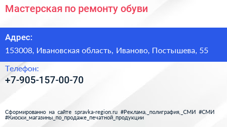 Мастерская по ремонту обуви по адресу 153008, Ивановская область, Иваново, Постышева, 55 в дальнейшем Организация, размещена в следующих категориях: