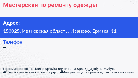Мастерская по ремонту одежды по адресу 153025, Ивановская область, Иваново, Ермака, 11 в дальнейшем Организация, размещена в следующих категориях: