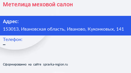Метелица, меховой салон по адресу 153013, Ивановская область, Иваново, Куконковых, 141 в дальнейшем Организация, размещена в следующих категориях:
