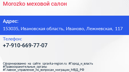 Morozko, меховой салон по адресу 153035, Ивановская область, Иваново, Лежневская, 117 в дальнейшем Организация, размещена в следующих категориях: