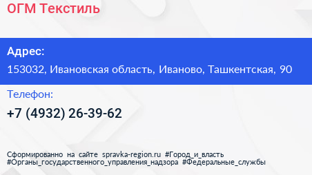 ОГМ Текстиль по адресу 153032, Ивановская область, Иваново, Ташкентская, 90 в дальнейшем Организация, размещена в следующих категориях: