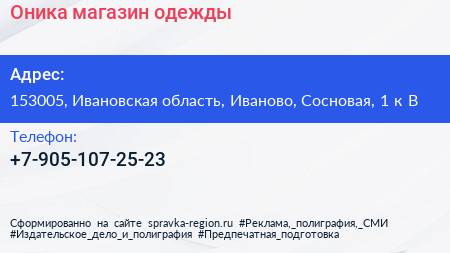Оника, магазин одежды по адресу 153005, Ивановская область, Иваново, Сосновая, 1 к В в дальнейшем Организация, размещена в следующих категориях: