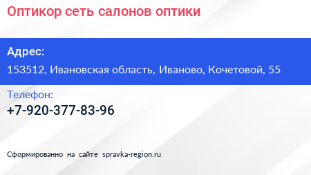 Оптикор, сеть салонов оптики по адресу 153512, Ивановская область, Иваново, Кочетовой, 55 в дальнейшем Организация, размещена в следующих категориях: