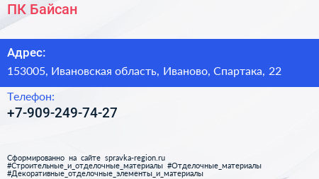 ПК Байсан по адресу 153005, Ивановская область, Иваново, Спартака, 22 в дальнейшем Организация, размещена в следующих категориях: