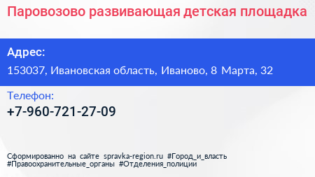 Паровозово, развивающая детская площадка по адресу 153037, Ивановская область, Иваново, 8 Марта, 32 в дальнейшем Организация, размещена в следующих категориях: