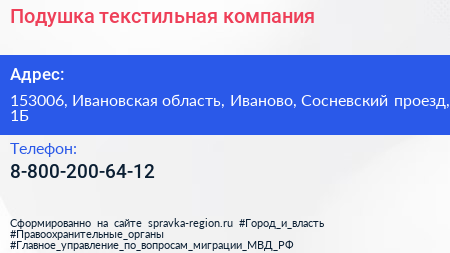 Подушка, текстильная компания по адресу 153006, Ивановская область, Иваново, Сосневский проезд, 1Б в дальнейшем Организация, размещена в следующих категориях: