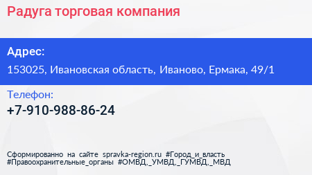 Радуга, торговая компания по адресу 153025, Ивановская область, Иваново, Ермака, 49/1 в дальнейшем Организация, размещена в следующих категориях: