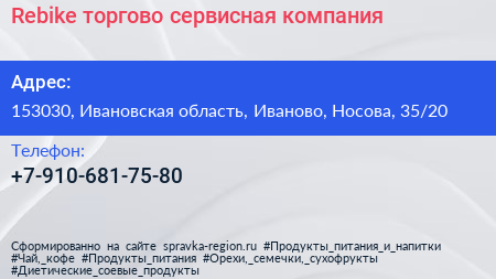 Rebike, торгово-сервисная компания по адресу 153030, Ивановская область, Иваново, Носова, 35/20 в дальнейшем Организация, размещена в следующих категориях: