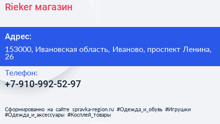 Rieker, магазин по адресу 153000, Ивановская область, Иваново, проспект Ленина, 26 в дальнейшем Организация, размещена в следующих категориях: