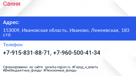 Санни по адресу 153009, Ивановская область, Иваново, Лежневская, 183 ст6 в дальнейшем Организация, размещена в следующих категориях: