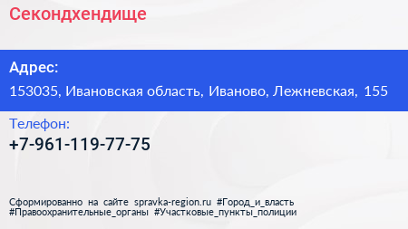 Секондхендище по адресу 153035, Ивановская область, Иваново, Лежневская, 155 в дальнейшем Организация, размещена в следующих категориях: