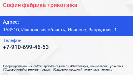 София, фабрика трикотажа по адресу 153510, Ивановская область, Иваново, Запрудная, 1 в дальнейшем Организация, размещена в следующих категориях: