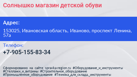 Солнышко, магазин детской обуви по адресу 153025, Ивановская область, Иваново, проспект Ленина, 57а в дальнейшем Организация, размещена в следующих категориях: