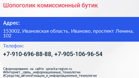 Шопоголик, комиссионный бутик по адресу 153002, Ивановская область, Иваново, проспект Ленина, 102 в дальнейшем Организация, размещена в следующих категориях: