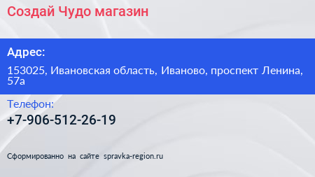 Создай Чудо, магазин по адресу 153025, Ивановская область, Иваново, проспект Ленина, 57а в дальнейшем Организация, размещена в следующих категориях: