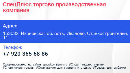 СпецПлюс, торгово-производственная компания по адресу 153032, Ивановская область, Иваново, Станкостроителей, 11 в дальнейшем Организация, размещена в следующих категориях: