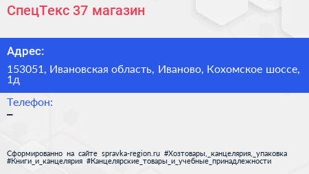 СпецТекс 37, магазин по адресу 153051, Ивановская область, Иваново, Кохомское шоссе, 1д в дальнейшем Организация, размещена в следующих категориях: