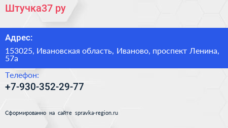 Штучка37.ру по адресу 153025, Ивановская область, Иваново, проспект Ленина, 57а в дальнейшем Организация, размещена в следующих категориях: