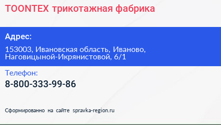 TOONTEX, трикотажная фабрика по адресу 153003, Ивановская область, Иваново, Наговицыной-Икрянистовой, 6/1 в дальнейшем Организация, размещена в следующих категориях: