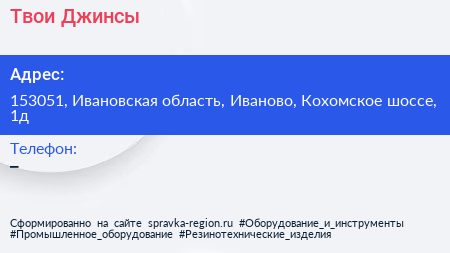 Твои Джинсы по адресу 153051, Ивановская область, Иваново, Кохомское шоссе, 1д в дальнейшем Организация, размещена в следующих категориях: