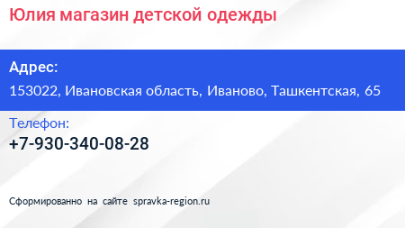 Юлия, магазин детской одежды по адресу 153022, Ивановская область, Иваново, Ташкентская, 65 в дальнейшем Организация, размещена в следующих категориях: