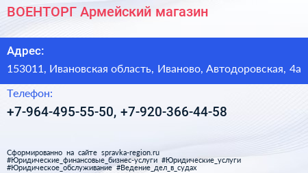 ВОЕНТОРГ, Армейский магазин по адресу 153011, Ивановская область, Иваново, Автодоровская, 4а в дальнейшем Организация, размещена в следующих категориях: