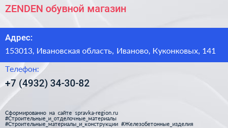 ZENDEN, обувной магазин по адресу 153013, Ивановская область, Иваново, Куконковых, 141 в дальнейшем Организация, размещена в следующих категориях: