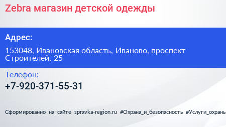 Zebra, магазин детской одежды по адресу 153048, Ивановская область, Иваново, проспект Строителей, 25 в дальнейшем Организация, размещена в следующих категориях: