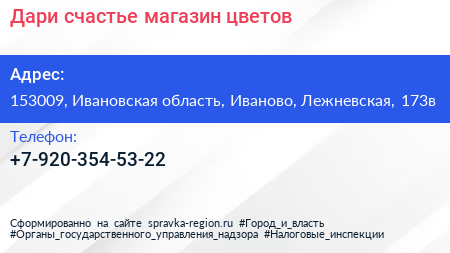 Дари счастье, магазин цветов по адресу 153009, Ивановская область, Иваново, Лежневская, 173в в дальнейшем Организация, размещена в следующих категориях: