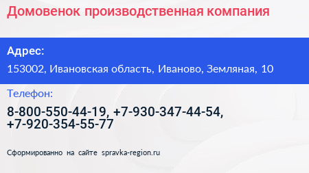 Домовенок, производственная компания по адресу 153002, Ивановская область, Иваново, Земляная, 10 в дальнейшем Организация, размещена в следующих категориях: