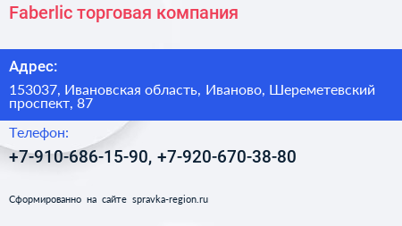 Faberlic, торговая компания по адресу 153037, Ивановская область, Иваново, Шереметевский проспект, 87 в дальнейшем Организация, размещена в следующих категориях: