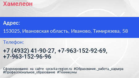 Хамелеон по адресу 153025, Ивановская область, Иваново, Тимирязева, 58 в дальнейшем Организация, размещена в следующих категориях: