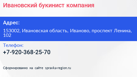 Ивановский букинист, компания по адресу 153002, Ивановская область, Иваново, проспект Ленина, 102 в дальнейшем Организация, размещена в следующих категориях: