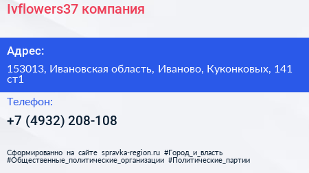 Ivflowers37, компания по адресу 153013, Ивановская область, Иваново, Куконковых, 141 ст1 в дальнейшем Организация, размещена в следующих категориях: