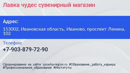 Лавка чудес, сувенирный магазин по адресу 153002, Ивановская область, Иваново, проспект Ленина, 102 в дальнейшем Организация, размещена в следующих категориях: