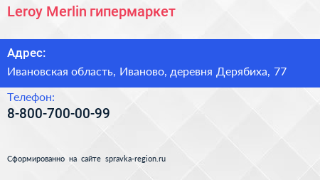 Leroy Merlin, гипермаркет по адресу Ивановская область, Иваново, деревня Дерябиха, 77 в дальнейшем Организация, размещена в следующих категориях: