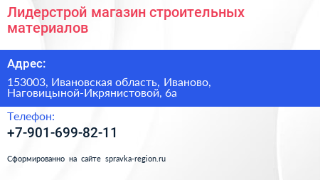 Лидерстрой, магазин строительных материалов по адресу 153003, Ивановская область, Иваново, Наговицыной-Икрянистовой, 6а в дальнейшем Организация, размещена в следующих категориях: