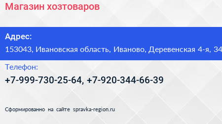 Магазин хозтоваров по адресу 153043, Ивановская область, Иваново, Деревенская 4-я, 34 в дальнейшем Организация, размещена в следующих категориях: