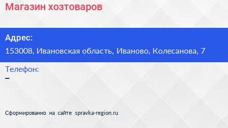 Магазин хозтоваров по адресу 153008, Ивановская область, Иваново, Колесанова, 7 в дальнейшем Организация, размещена в следующих категориях:
