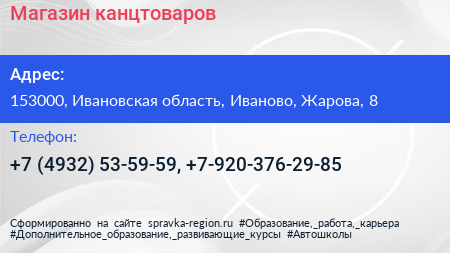 Магазин канцтоваров по адресу 153000, Ивановская область, Иваново, Жарова, 8 в дальнейшем Организация, размещена в следующих категориях:
