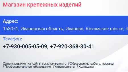Магазин крепежных изделий по адресу 153051, Ивановская область, Иваново, Кохомское шоссе, 4 в дальнейшем Организация, размещена в следующих категориях: