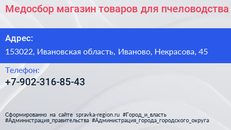 Медосбор, магазин товаров для пчеловодства по адресу 153022, Ивановская область, Иваново, Некрасова, 45 в дальнейшем Организация, размещена в следующих категориях: