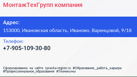 МонтажТехГрупп, компания по адресу 153000, Ивановская область, Иваново, Варенцовой, 9/18 в дальнейшем Организация, размещена в следующих категориях: